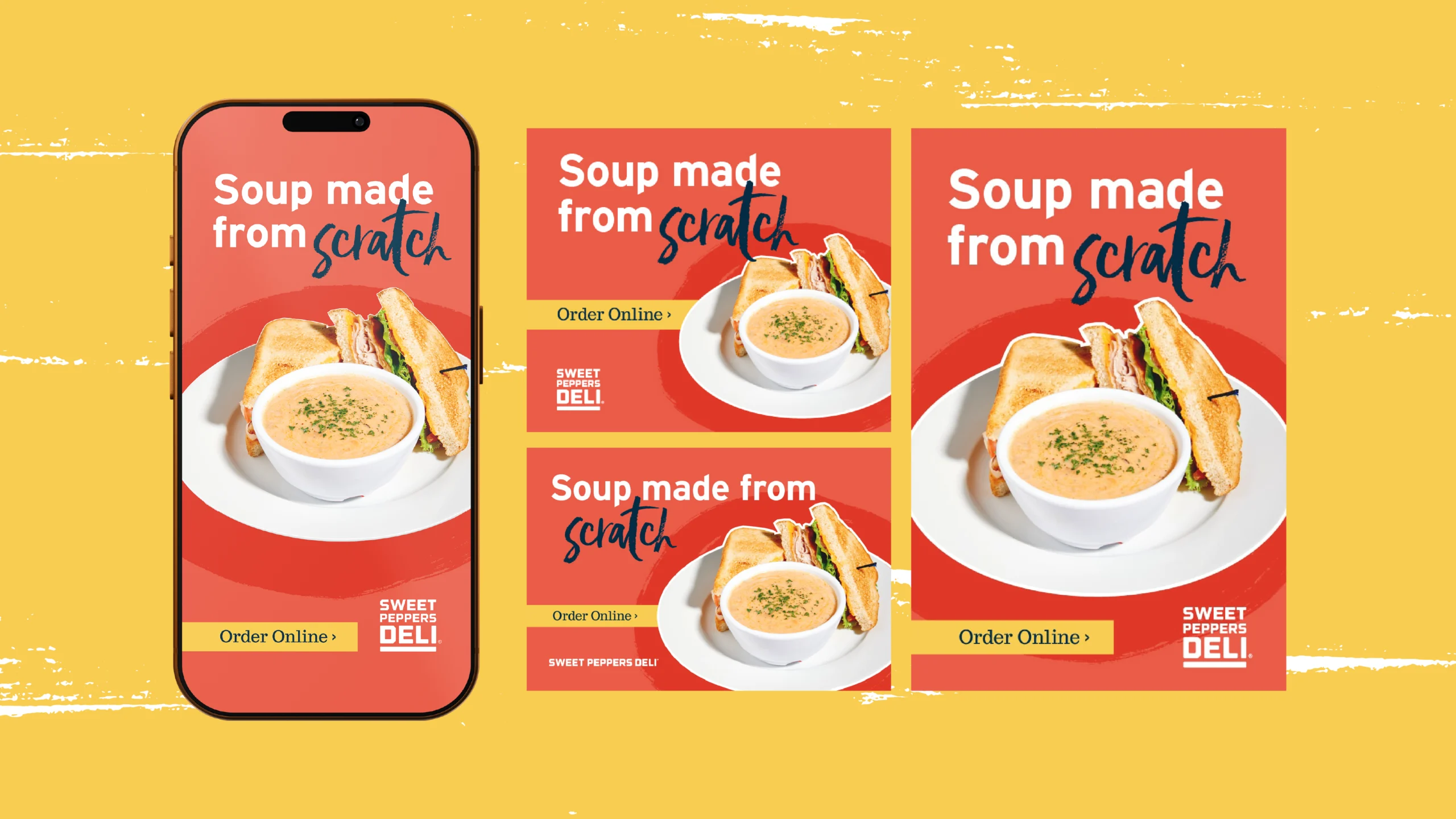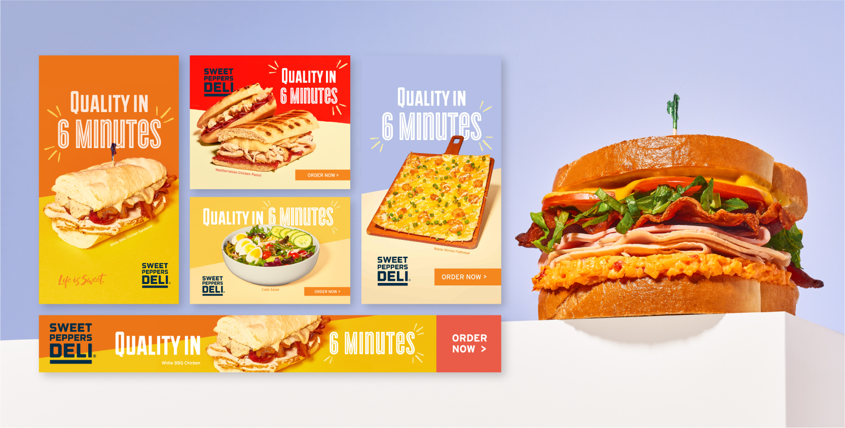 Sweet Peppers Deli sets expectations before guests ever walk in. Custom photography leads the work, putting the food front and center while elevating how the brand shows up in market. The imagery signals care, consistency, and pride, reinforcing a promise of uncompromising service and quality. Each execution feels confident and inviting, raising the bar for what fast casual can look and feel like.