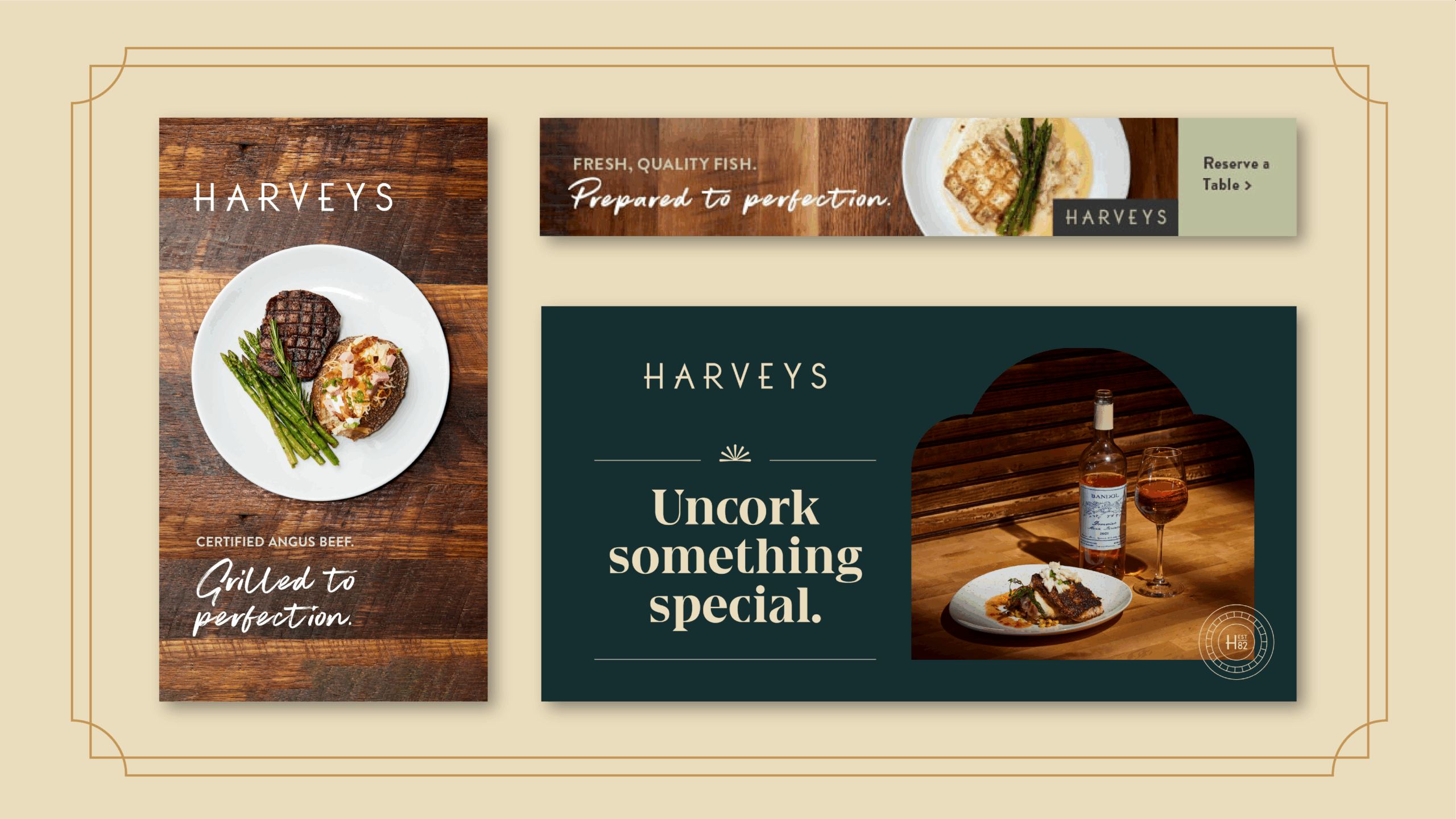 Harveys reinforces trust built over time. The work draws from the restaurant’s history, presenting a familiar name with renewed clarity and polish. Messaging and visuals emphasize stability, quality, and experience, assuring longtime guests while signaling to new diners that this is a place with standards, consistency, and staying power.