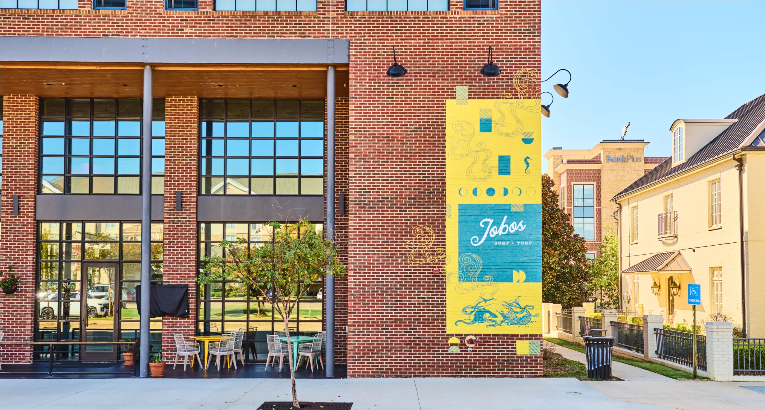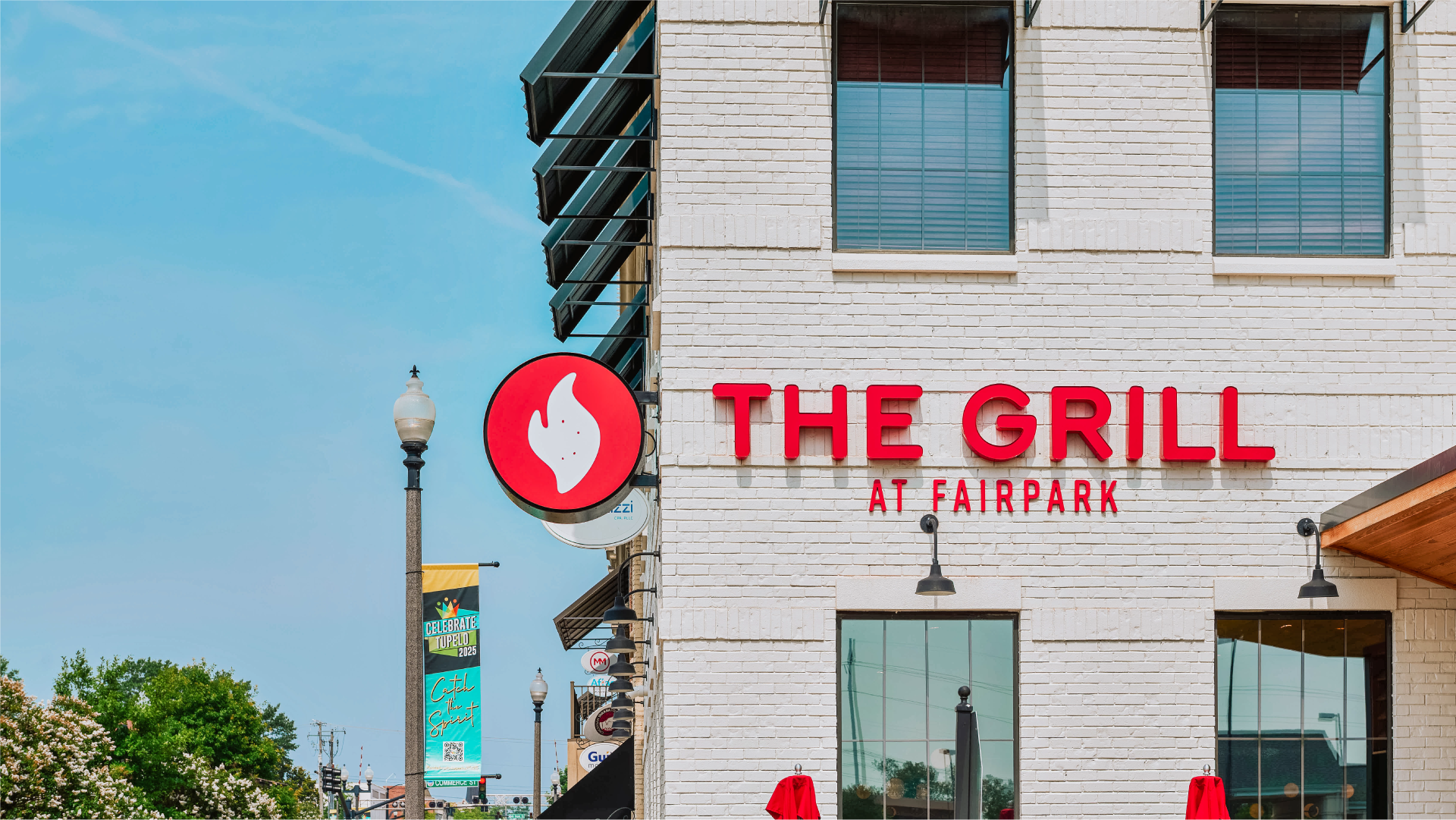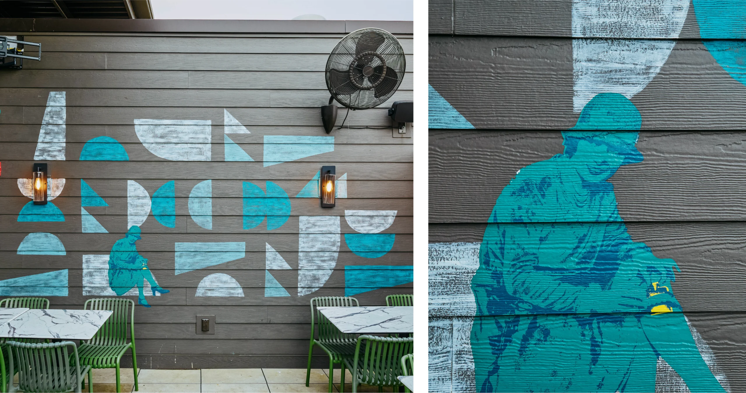 The Grill’s work grew out of a remodel that became a catalyst for bolder decisions. Collaboration with an architect led to a sculptural patio facing traffic, designed to pull attention from the street. The building was repainted inside and out, with new custom signage and artwork layered throughout. Balanced use of color pushed the space forward, giving the restaurant renewed presence and energy.