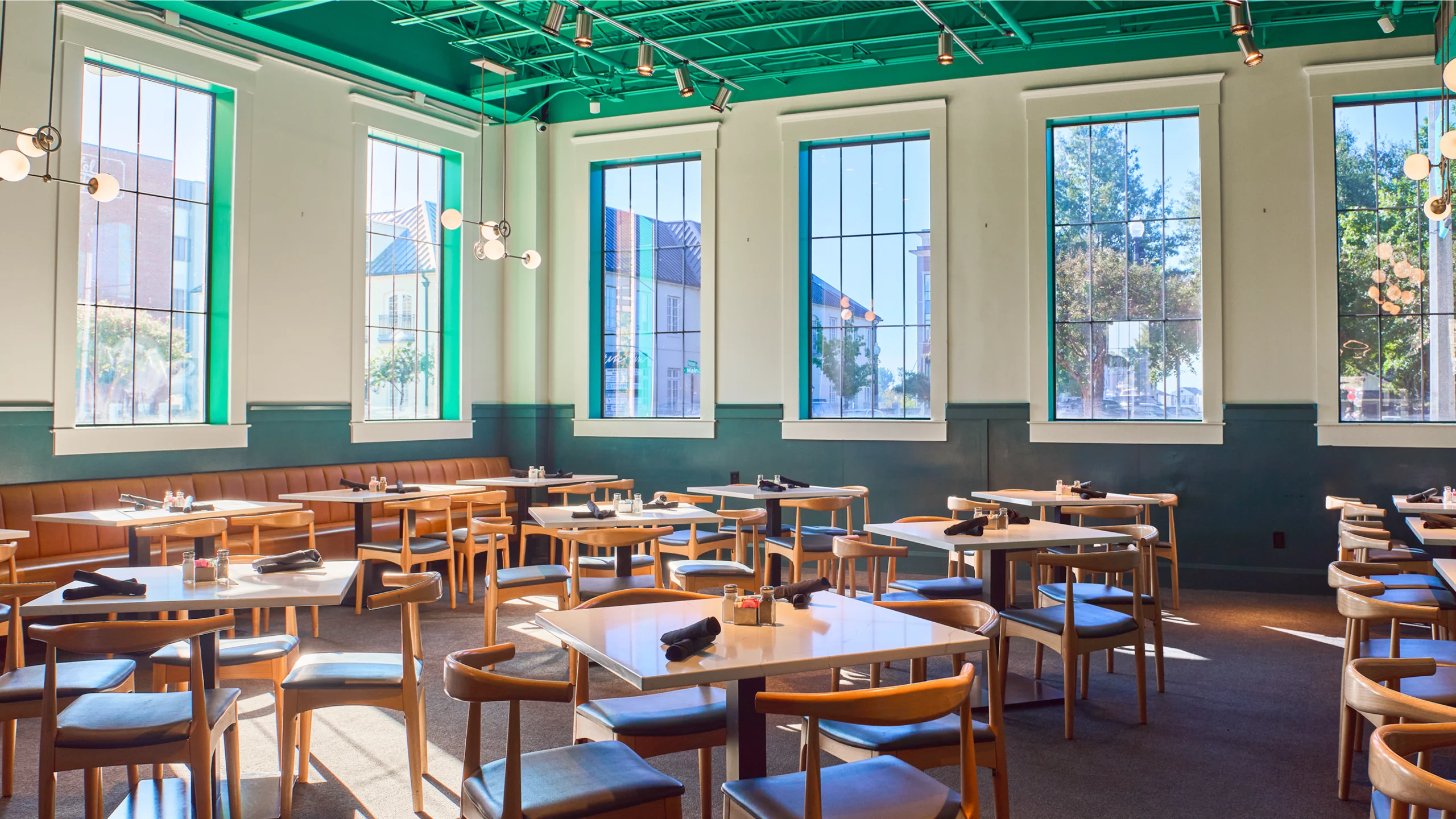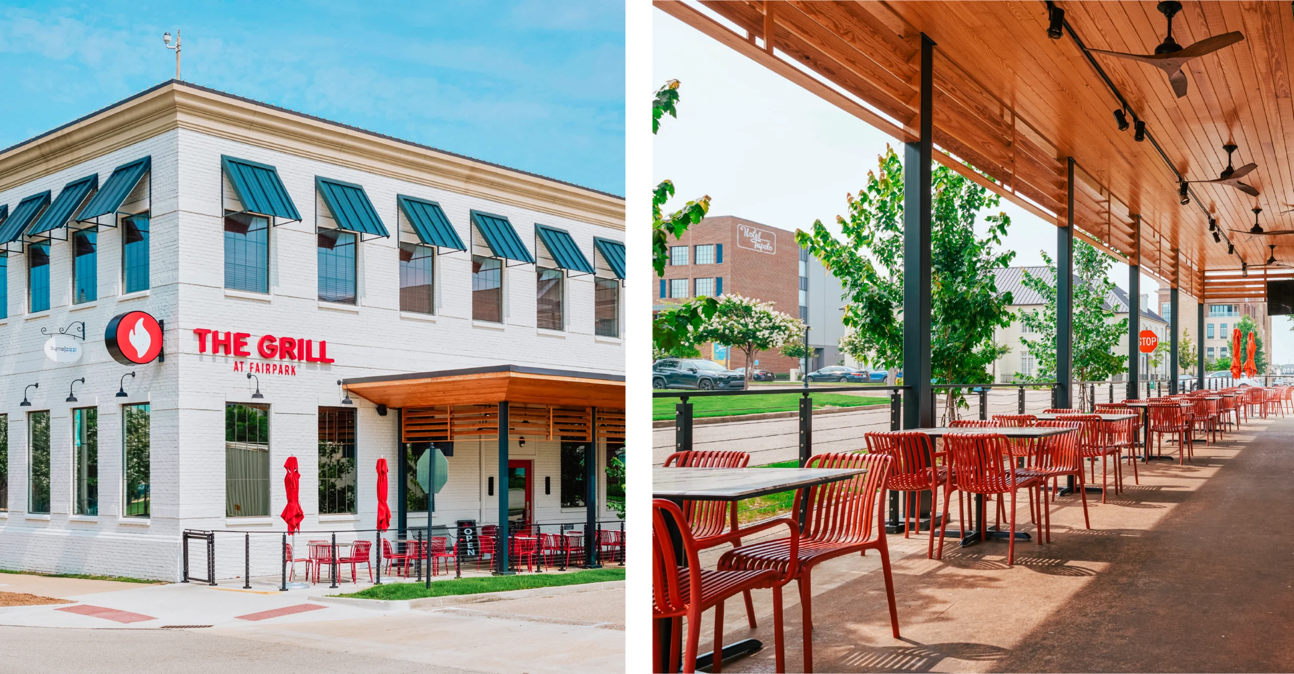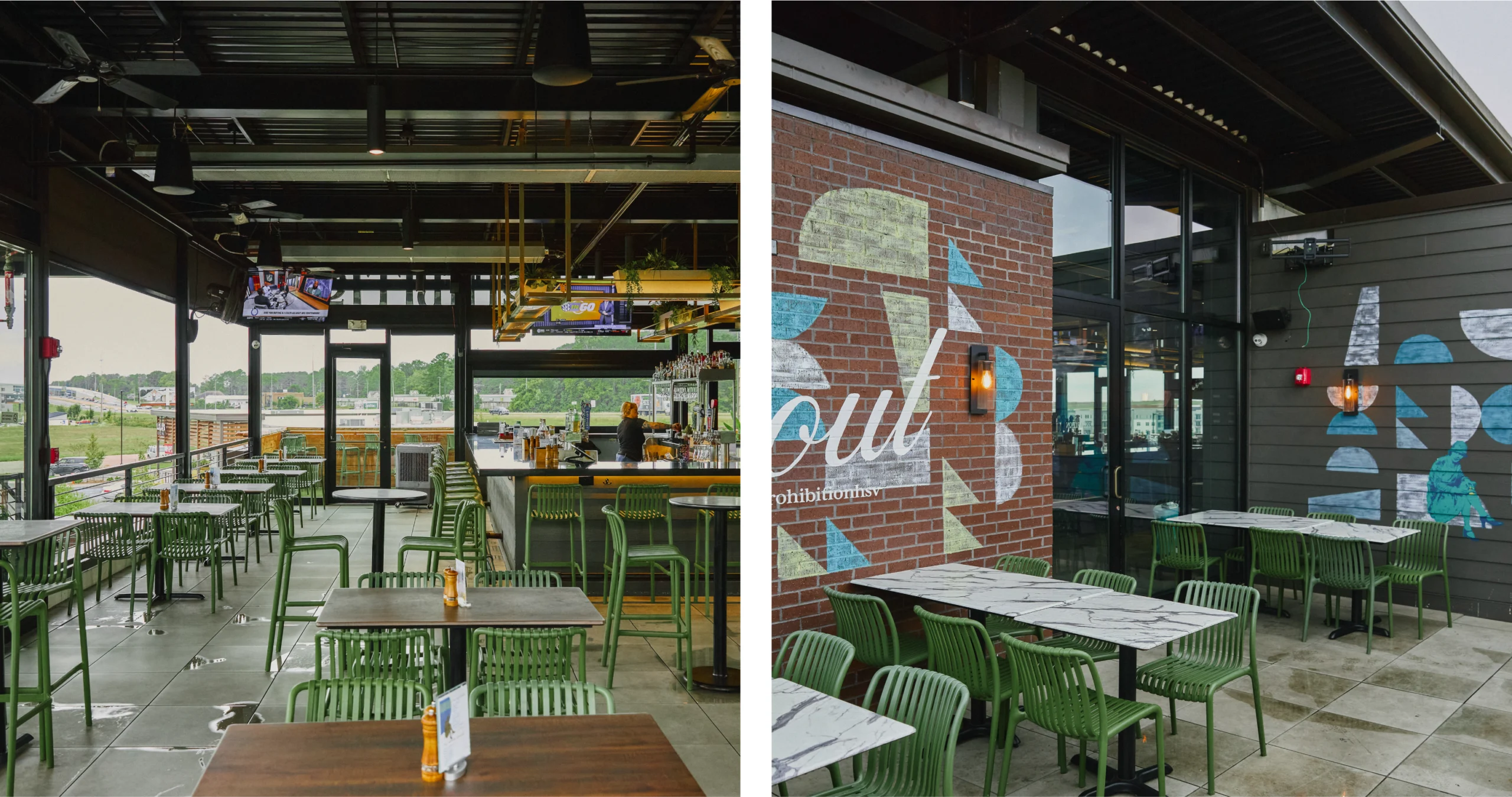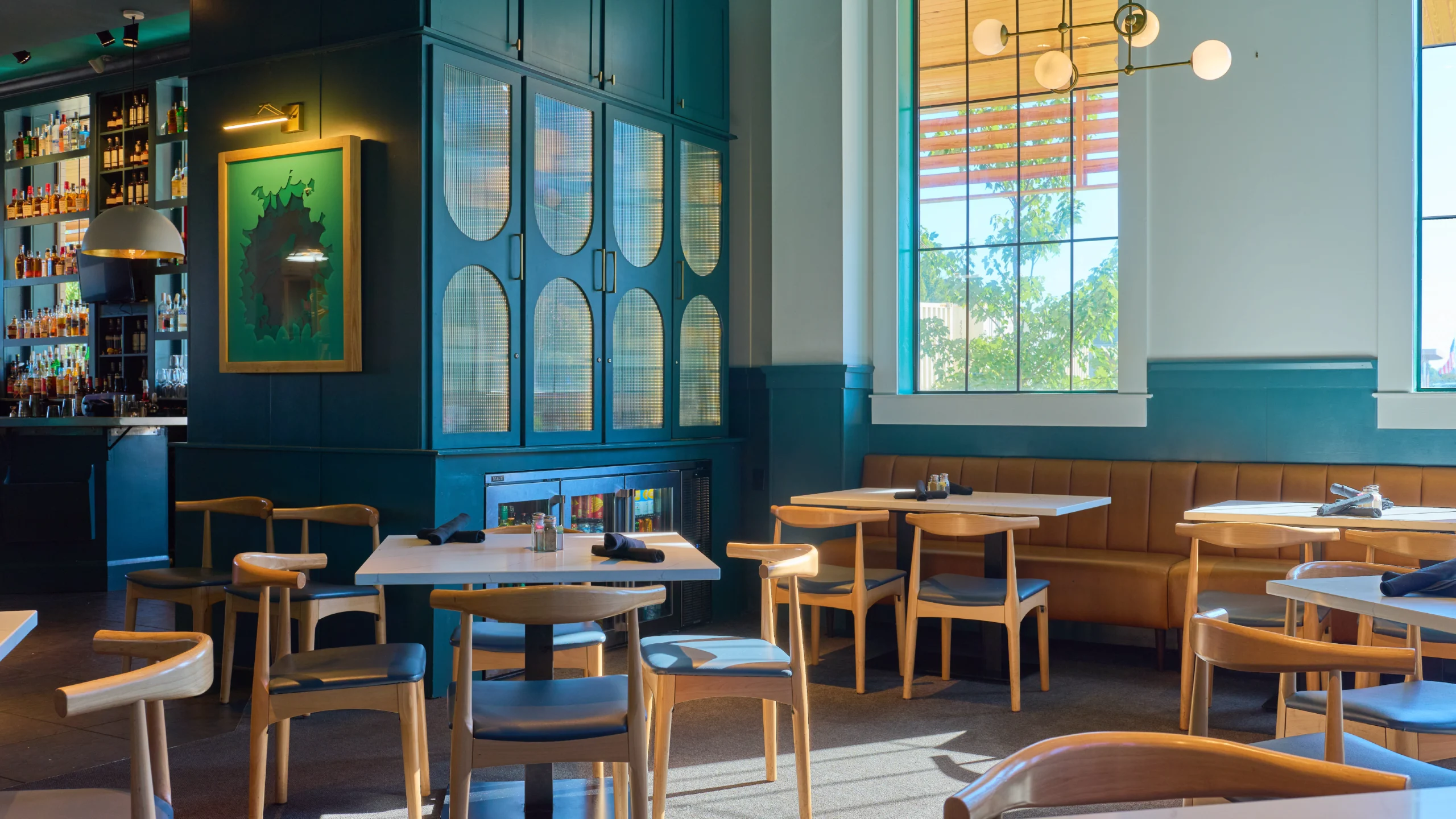 The Grill’s work grew out of a remodel that became a catalyst for bolder decisions. Collaboration with an architect led to a sculptural patio facing traffic, designed to pull attention from the street. The building was repainted inside and out, with new custom signage and artwork layered throughout. Balanced use of color pushed the space forward, giving the restaurant renewed presence and energy.